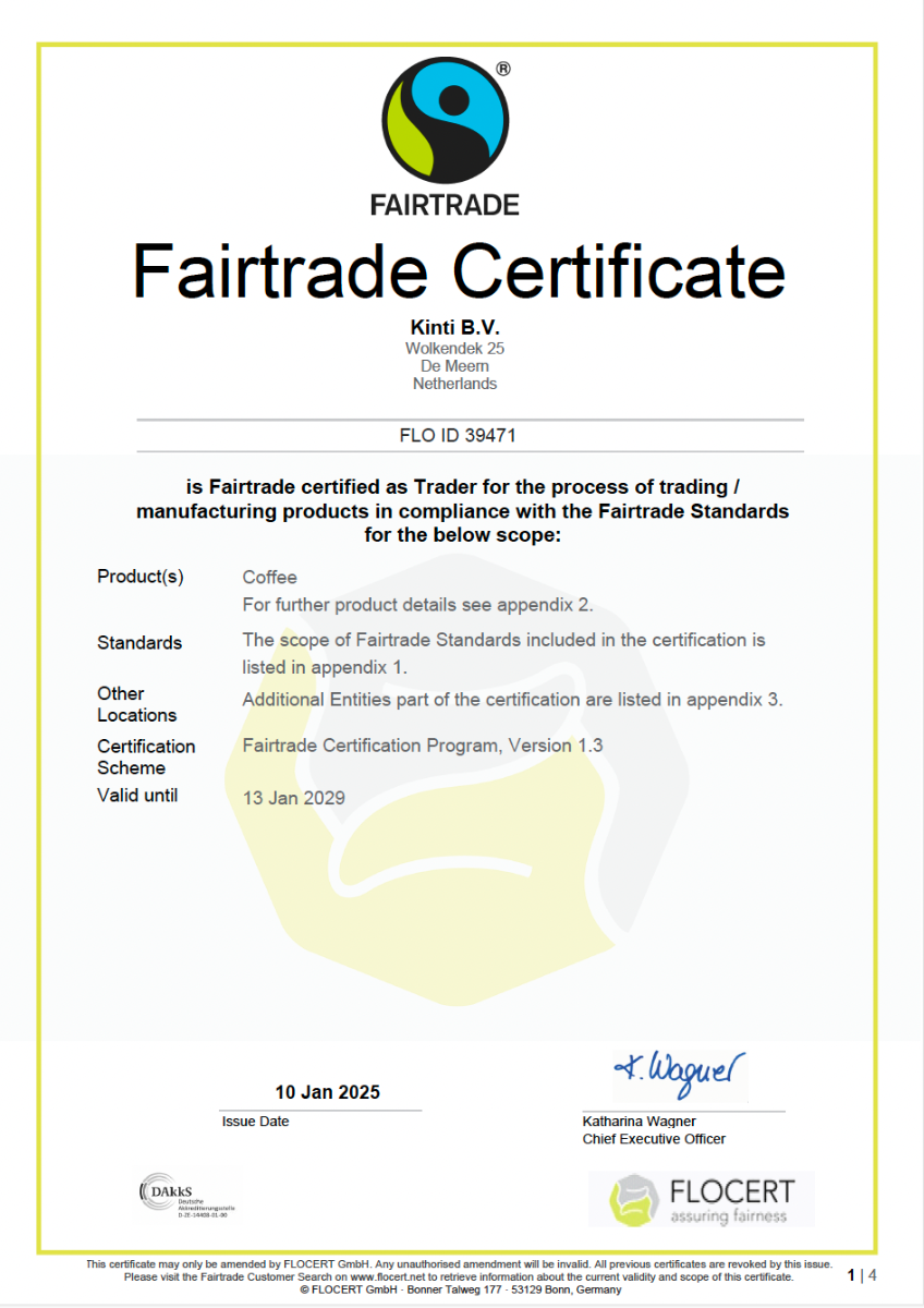- Het certificeringsdocument toont aan dat we voldoen aan de hoogste normen voor ethische bedrijfsvoering en dat we ons inzetten voor een betere toekomst voor de producenten van onze koffie en hun gemeenschappen.