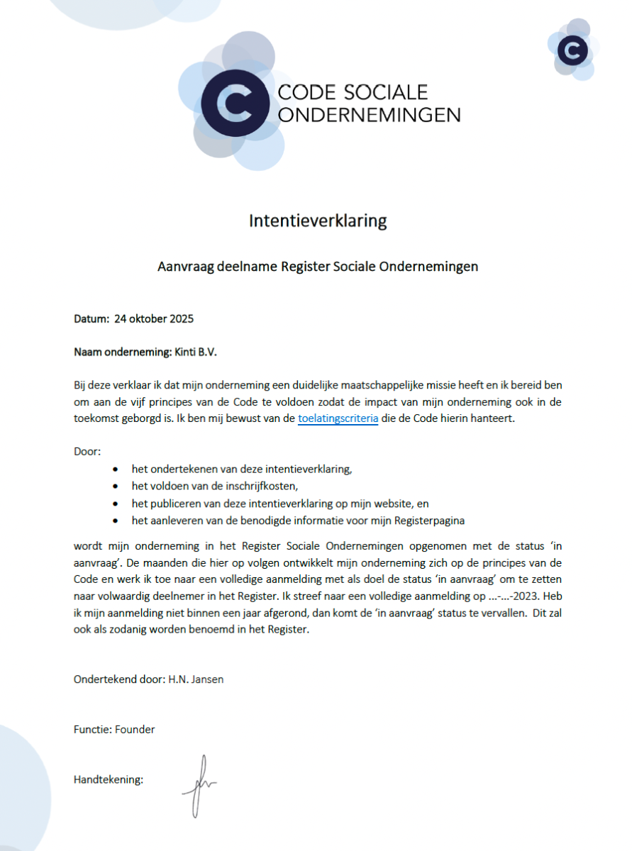 - Kinti BV is per 14-12-2022 opgenomen in het Register Sociale Ondernemingen met de status ‘in aanvraag’. Door het ondertekenen van de intentieverklaring van de Code Sociale Ondernemingen committeren wij ons aan het aanmeldingsproces met als doel opgenomen te worden als deelnemer in het Register.